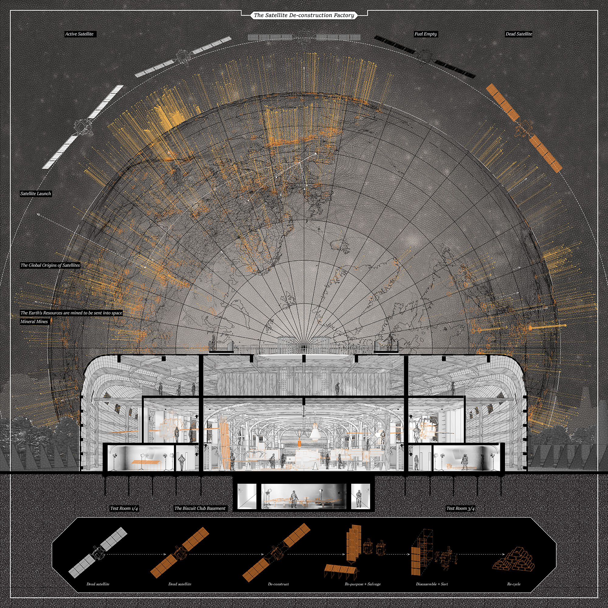 Mission Astraea champions the embodied carbon of satellites, their life cycle and the potential to create a complex infrastructural system, where satellite production, launch, active life, recovery and re-use are processes within a circular economy. Years of launching satellites from earth has littered outer-space with high-value debris consisting of dead satellites, rocket bodies, space shuttles, asteroids and other human-made objects. Space is becoming an ever-expanding extra-terrestrial landfill, and with objects orbiting earth at thousands of miles per hour collisions risk cluttering space beyond use.